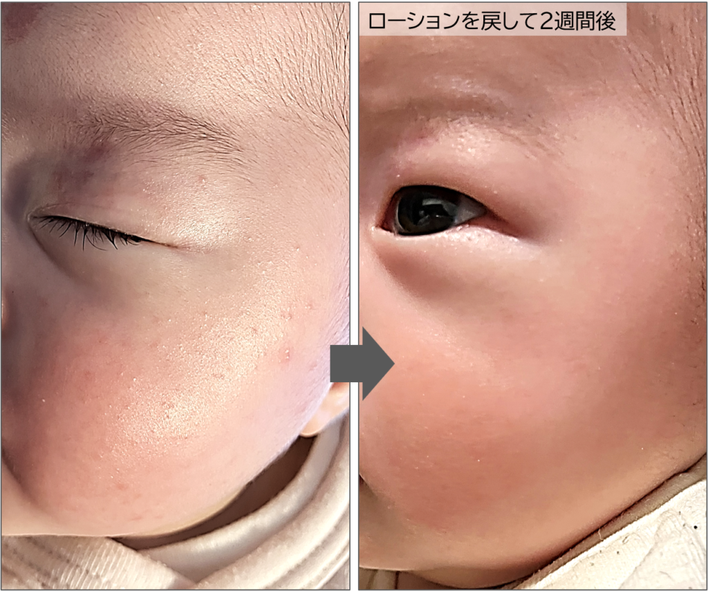 そして、アロベビーに戻して約2週間。 あんなに悩んでいた湿疹がほとんどなくなり、つるんとした「元のきれいなお肌」に戻ることができたのです。