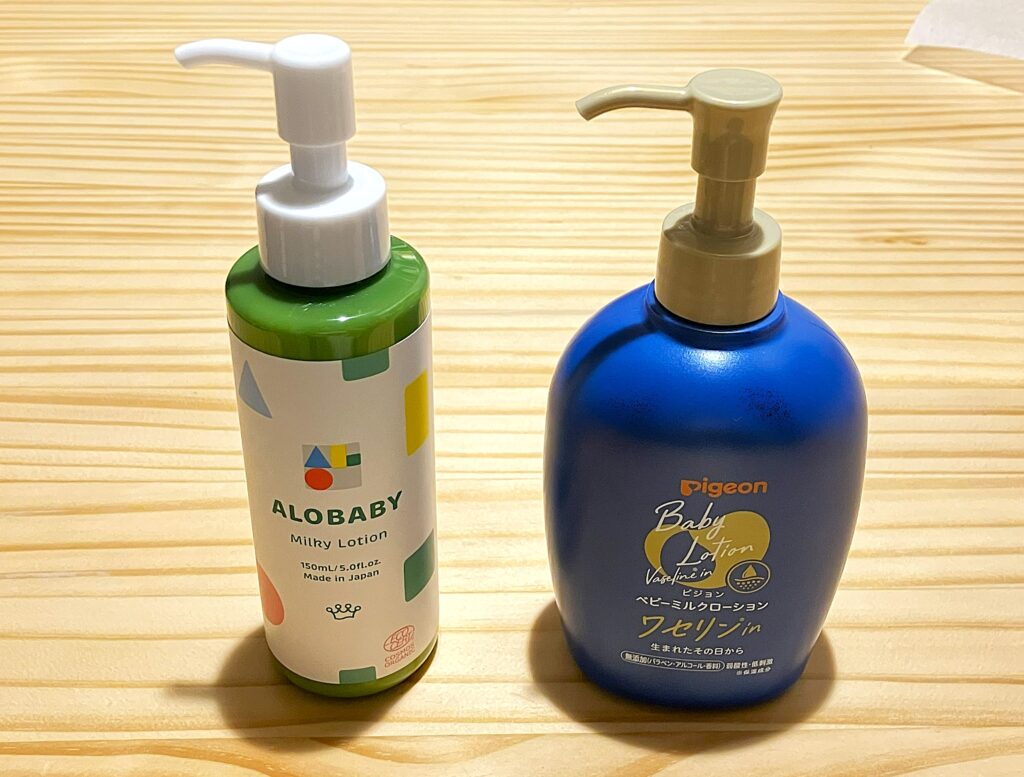 アロベビーを1本使い切り、ドラッグストアで手軽に購入できるピジョンのローションに切り替えたタイミングでした。ピジョンの製品は、伸びが良くて肌にスッとなじみ、ベタつきも少なくて、親としては非常に使い心地が良いと感じていました。