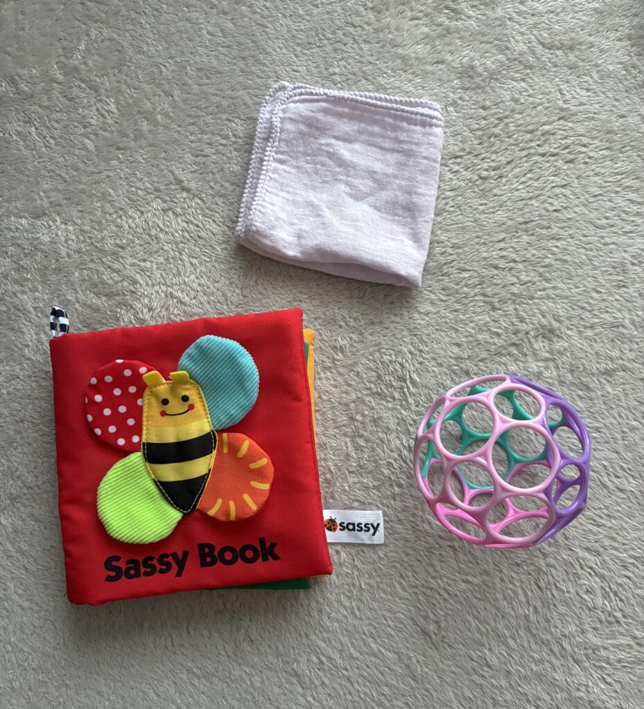 ぬいぐるみやガラガラ、布絵本などを早めに揃えましたが、生後2ヶ月くらいまではあまり興味を示しませんでした。それよりも、自分の服やガーゼをつかんで感触を楽しんでいることの方が多く、「なんだ、ガーゼで良かったのか!」と拍子抜けしてしまいました。